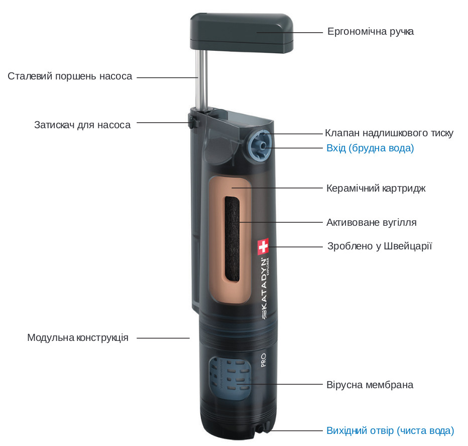 Katadyn Explorer Pro — це професійний очищувач води з унікальною триступеневою системою, яка поєднує керамічну мікрофільтрацію, активоване вугілля та мембрану для видалення вірусів. Така комбінація забезпечує комплексний захист навіть у сильно забруднених джерелах води.