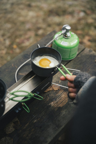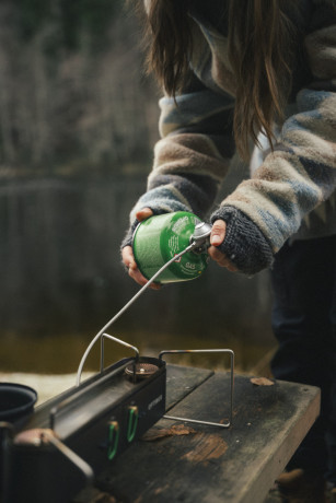 - Пальник працює від одного балона, що сприяє економії ваги та об'єму в багажі. Сумісний з різьбовими балонами стандарту EN417 об'ємом 110 г, 230 г та 450 г будь-яких виробників.